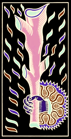 Sphinxes, such as those who ‘pull’ the triumphal Chariot in some decks, were guardians of mysteries and the dead. As human-lion anthropomorphs, they are also symbolic of Aquarius/Leo (or, previously, Leo/Aquarius). We might view the pelt-clad Heracles as an initiate, a man not yet integrated with the solar lion in the spiritual sense. (He did actually become an initiate of the mysteries, but only in order to capture Cerberus). He is still an accursed bête, wearing the old skin but not yet the golden crown of the solar lion (the Nemean lion he flayed represents the constellation of Leo).