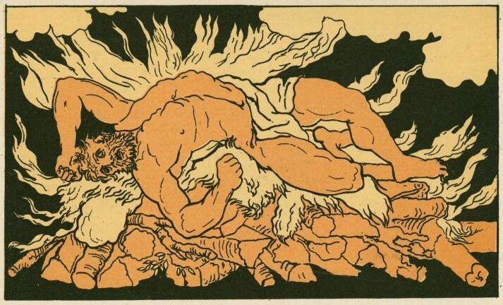 Heracles, in burning agony, throws himself on the fire