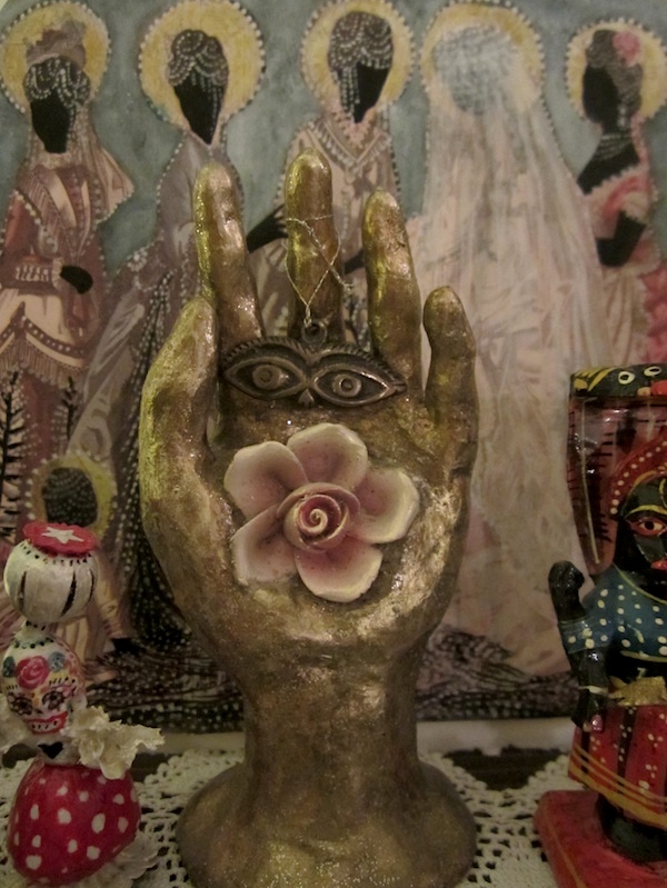 Who was Fatima? She seems to have many incarnations…in Islam, she’s the daughter of the prophet Muhammad, five years old when her father began receiving revelations. In Catholicism she’s a Marian apparition, reported in Portugal by three shepherd children. In legend, she is sometimes a great warrior princess, other times, as in ‘Fatima the Spinner and the Tent‘, an artisan who’s accumulated crafting skills and ingenuity save her from one calamitous situation after another. This Sufi retelling of Greek folklore describes Fatima in her role as creatrix and teacher, of which the female hand symbol is perhaps most indicative. Lucky? Yes, because I learned how to make things and can show you how.