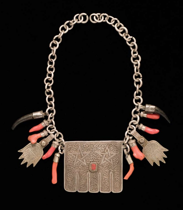 Khamsa necklace of silver, horn, coral, late 20th c, Morocco