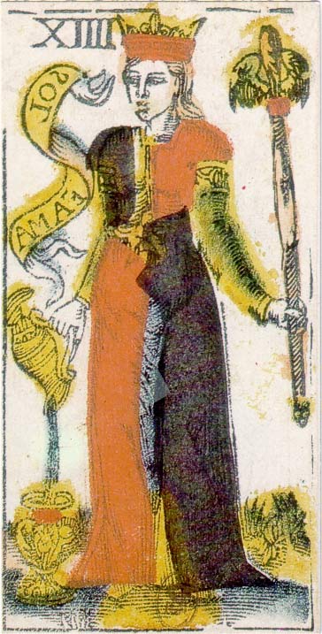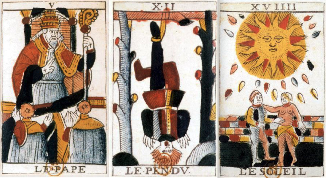 As with the fish and horses, the two tree bases in arcanum 12 are usually different, sometimes even containing sun and moon in them, as in the Vieville example. The figure can be flipped vertically and viewed two ways; hanging or dancing. His golden, solar hair is a clue to what’s going on – ‘the beauty of his inward self’ is slowly being revealed as he undergoes ‘living death’. Two of these oldest TdM examples (Vieville, Dodal) require flipping the card to read the number correctly – printer mistake?