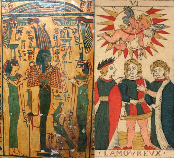 A more joyous union, or at least the beginning of one, is beautifully illustrated in the 2 of Cups. Typically in Tarot de Marseille, the two dolphin-fish are slightly different in appearance. This twin fish theme, besides being Piscean, can also be traced back to the ancient, pagan world. In the sanctuary of Didyma (“twins”, thought to refer to twin temples of Apollo and Artemis), Greece, for example, we find a figure not unlike the split-tailed melusine (aka the Starbucks mermaid), who grasps her two tails, or sometimes two fish, much like the ones in the Cups card.