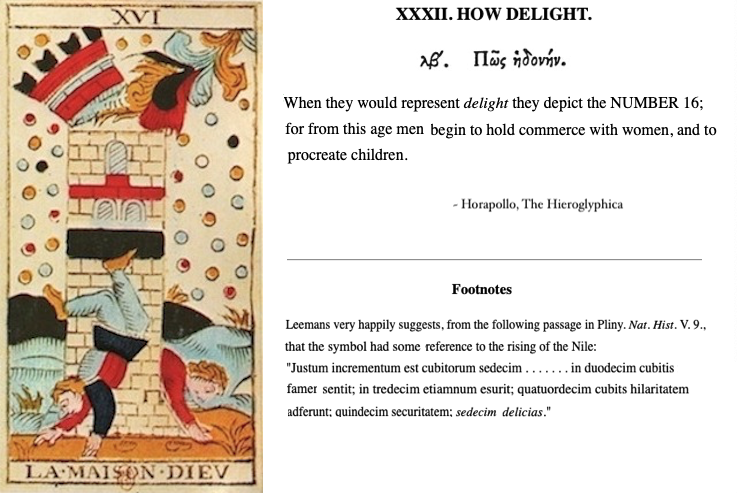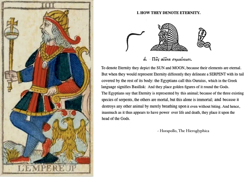 It was out of this tradition that Tarot de Marseille emerged, presumably in Italy, during the mid 16th century. [No known prior examples of the classic TdM format exist and the oldest known example of a triumph is a single, World card – the oldest complete decks known are 17th century.] Its images are not just allegorical, but ‘hieroglyphic’ in nature – though obviously not actual Egyptian hieroglyphs. The apparent (I would even say obvious) application of Horapollo’s descriptions alone leaves little doubt, though, that they were purposefully designed with visual clues that provided a context for imbedded messages. What that purpose was and why playing cards, we can’t know for certain, but as Counter-Reformation loomed on the horizon, maybe it was time to encapsulate esoteric principals for future ages?