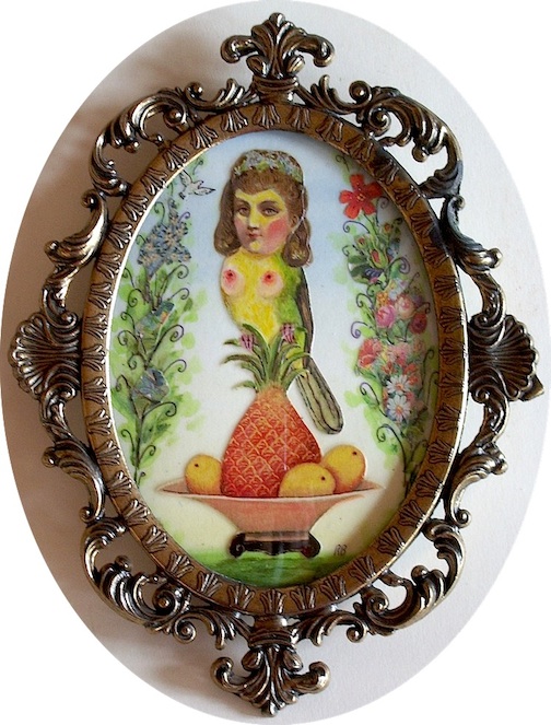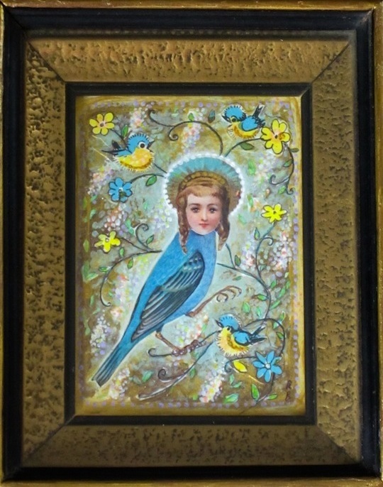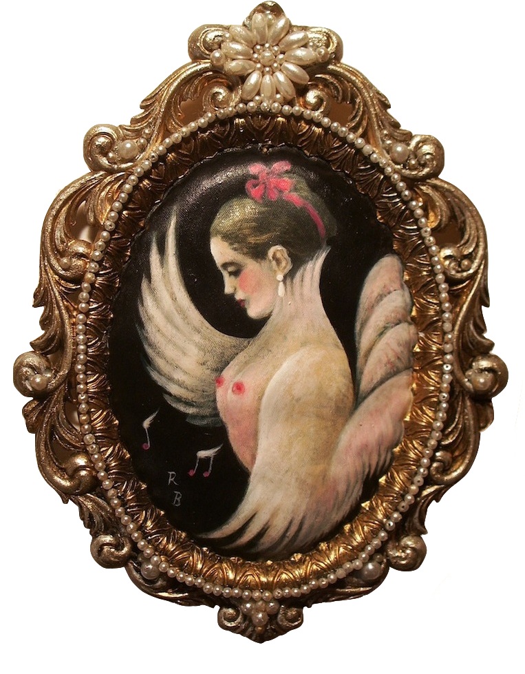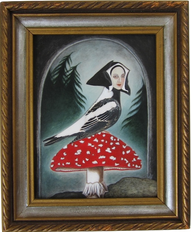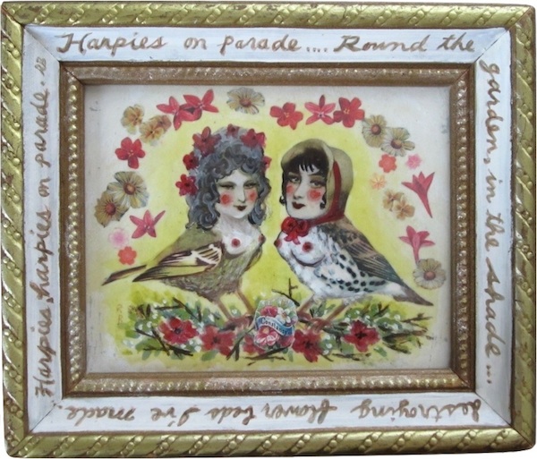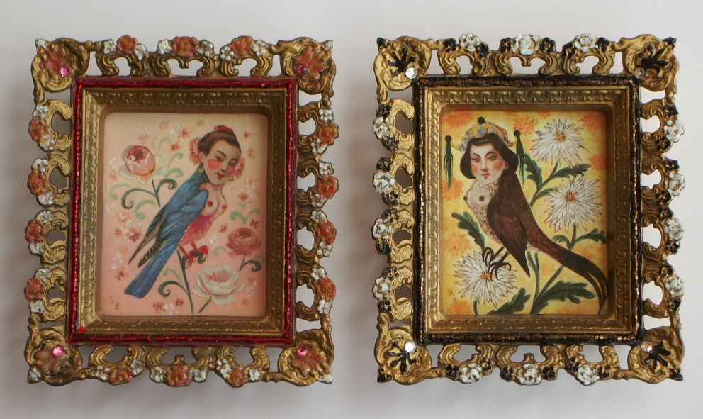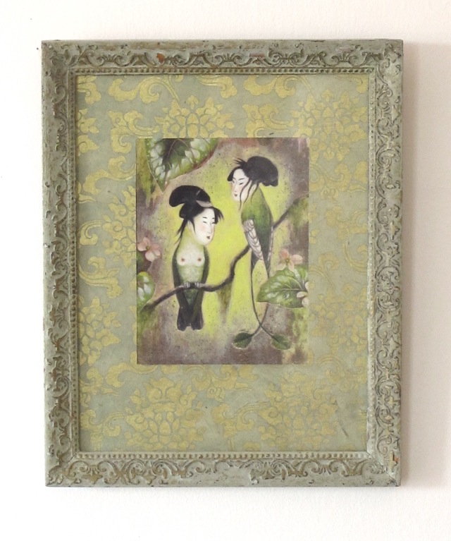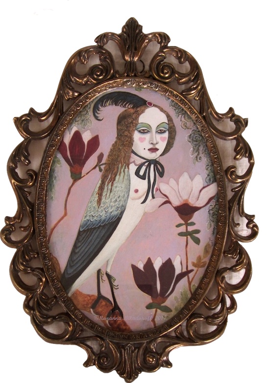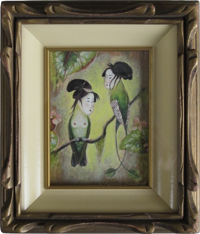 For this series, I wanted to portray the winged sirens more like garden song-birds, placing individuals or pairs in imagined, ‘natural surroundings,’ as if in a birder’s guide. I’d also collected small, antique frames from thrift stores and they just seemed right for some ornate, little portraits, which could be sold more easily than large works.