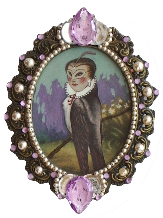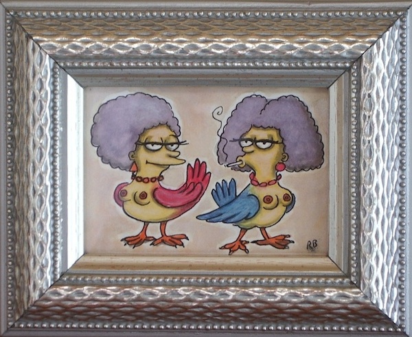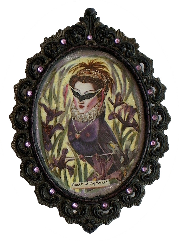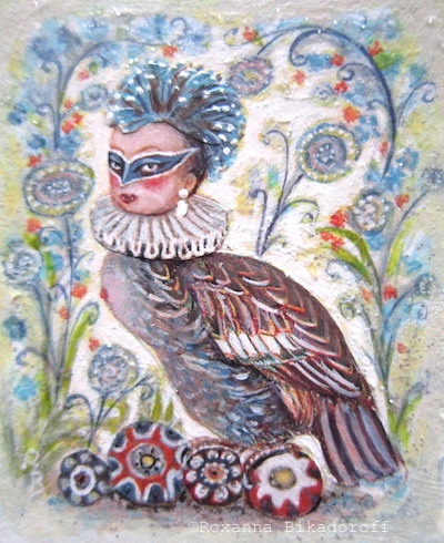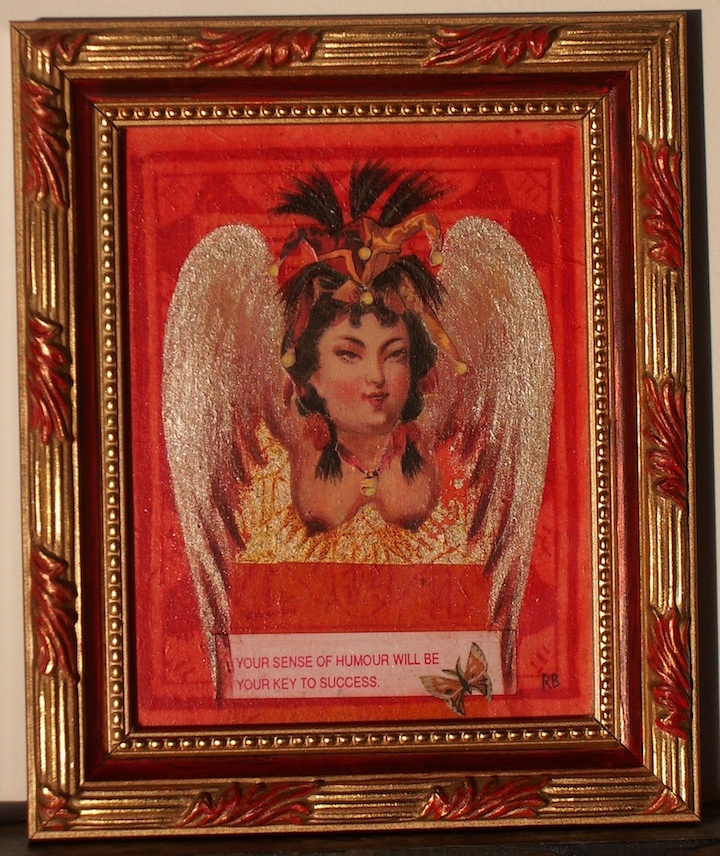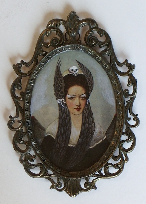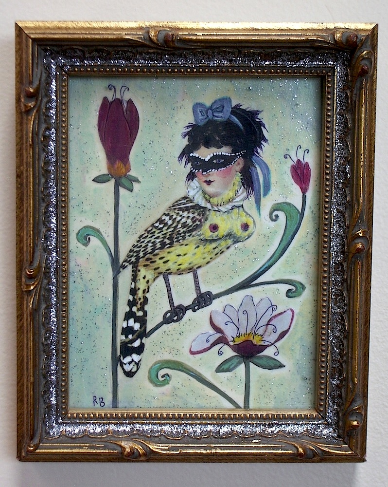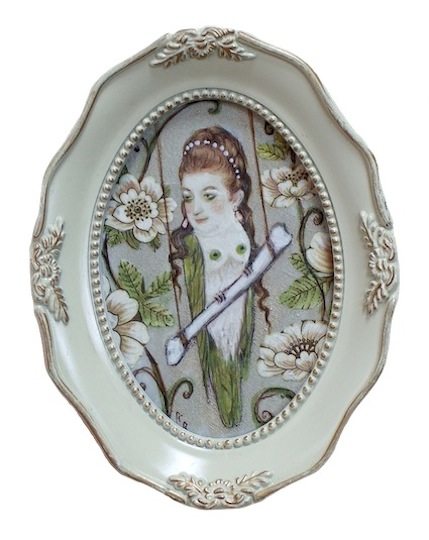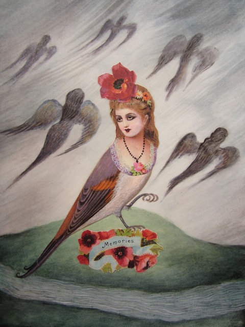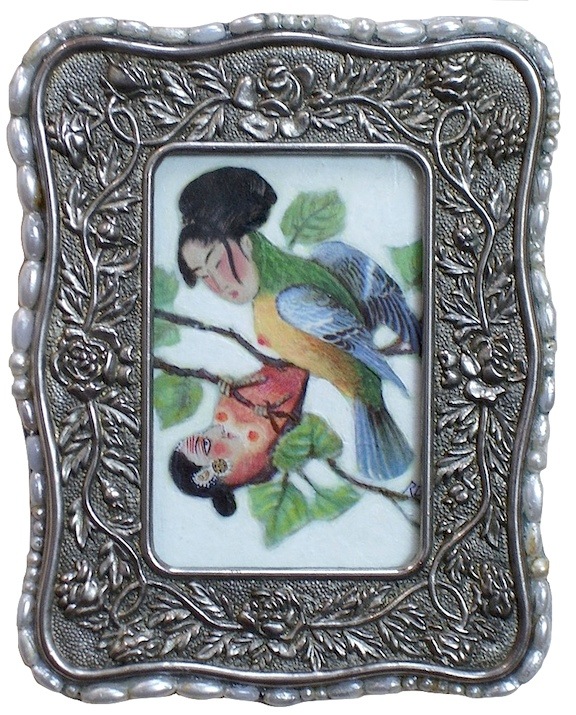For this series, I wanted to portray the winged sirens more like garden song-birds, placing individuals or pairs in imagined, ‘natural surroundings,’ as if in a birder’s guide. I’d also collected small, antique frames from thrift stores and they just seemed right for some ornate, little portraits, which could be sold more easily than large works.