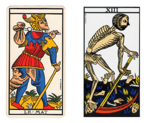 The archetype of the Fool in Tarot is one who has left the realm of perceived reality, of wealth, possessions, pain and attachments. It sounds a bit like dying, but it’s actually freedom from death. Transcendent, he wafts between forms like a breeze and has no fear of reaching the end. He knows there isn’t one, so is free to live life “1000%.” Most of us find it hard to get past the more finite idea of death. It’s terrifying, like the Grim Reaper in arcanum 13 and to be avoided at all costs. The two figures strike a very similar pose (this feature is unique to Tarot Marseille), plus, one is unnumbered, while the other is unnamed – it would seem they illustrate the dual experiences of facing imminent death, as depicted in the two photographs at the opening of the post.