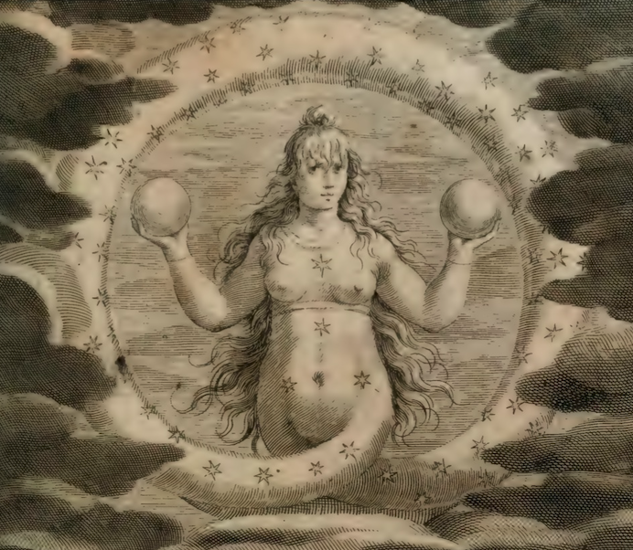 The androgynous figure pours one jug onto the earth and one into the water, as she will do in the classic Tarot de Marseille card. We get the sense of purification by libation – libation of feminine fluids – as well as the cyclical nature of water, aka life, connecting with her arms in a continuum. In alchemy the liquid purification of spirit is considered Lunar and feminine, inner.