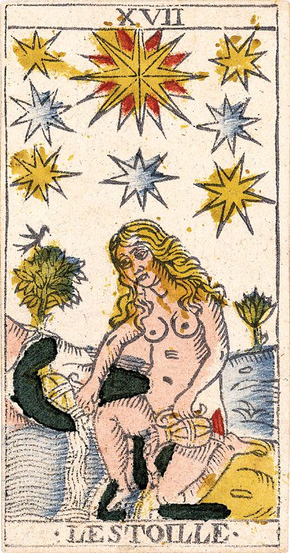 If we count the number of little plants sprouting from the earth in the Cary card, they equal the number of small stars. As above, so below. Inner quintessence = outer/cosmic. This unification can only happen after the Tower – the structures we build around our minds from the outer, ego, etc – has been transformed. The star not only depicts ‘outer space’ but ‘inner space.’