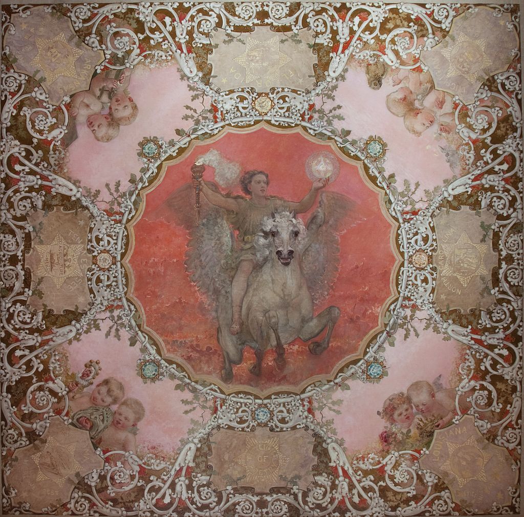 Justice appears in the mural a few times, in different forms; most prominently she’s seated on a throne (‘Distributive’ and ‘Commutative’ Justice), a hand resting on either scale, whereupon two angels dish out punishment or reward. She looks upward toward the higher power, Wisdom, who looks up to God. A cord runs from each scale (one is worn away) to the hand of Concordia, symbolizing a balanced state of society. Everything is connected in perfect equilibrium, everyone knows their place and responsibility as citizens.