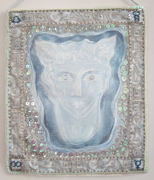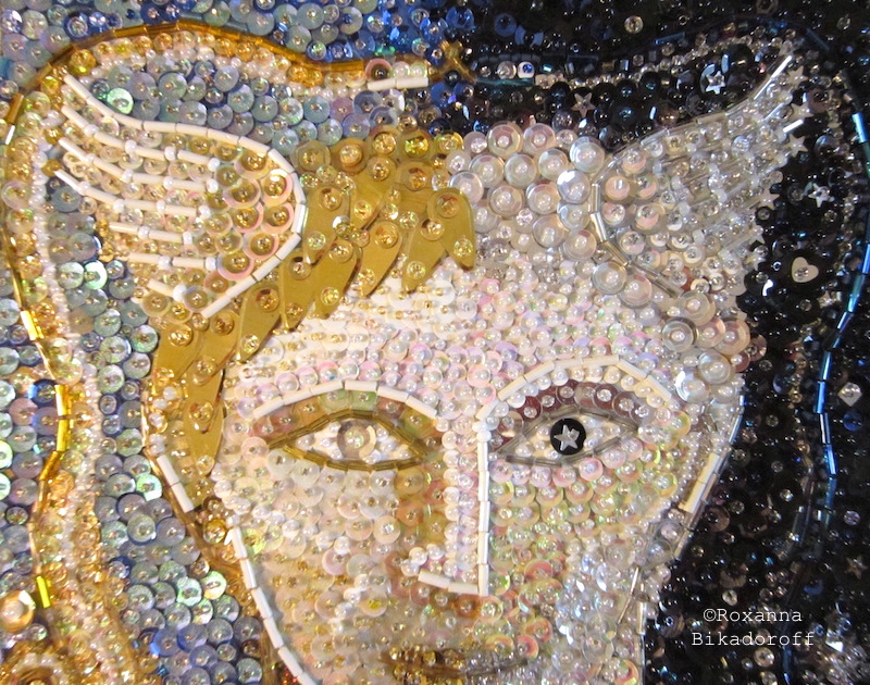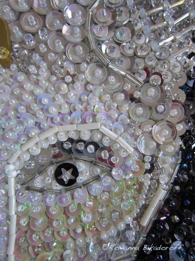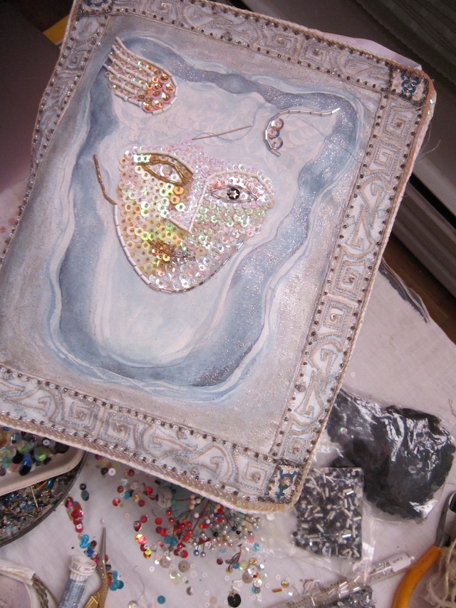 My earlier sequinned tapestries are inspired largely by Haitian ‘drapo’, but this smaller piece was also influenced by painterly, Roman mosaics. It does feel like I’m ‘painting’ with sequins, sometimes applying two or three on top of each other and choosing opalescent or metallic beads to achieve the right luminosity and gradation. Mercurius reflects differently, depending on light and angle. Sunlight can give him a pinkish hue.