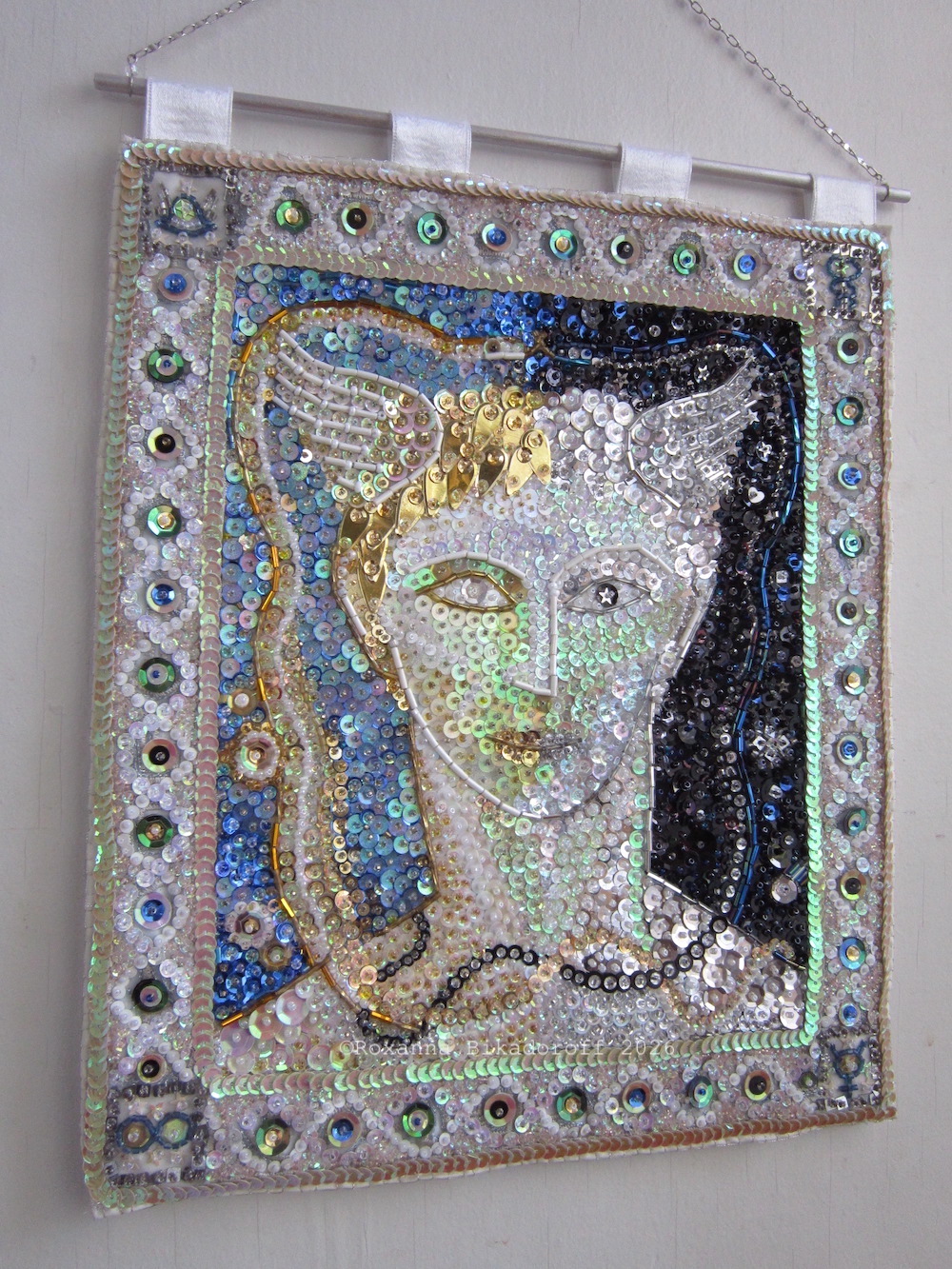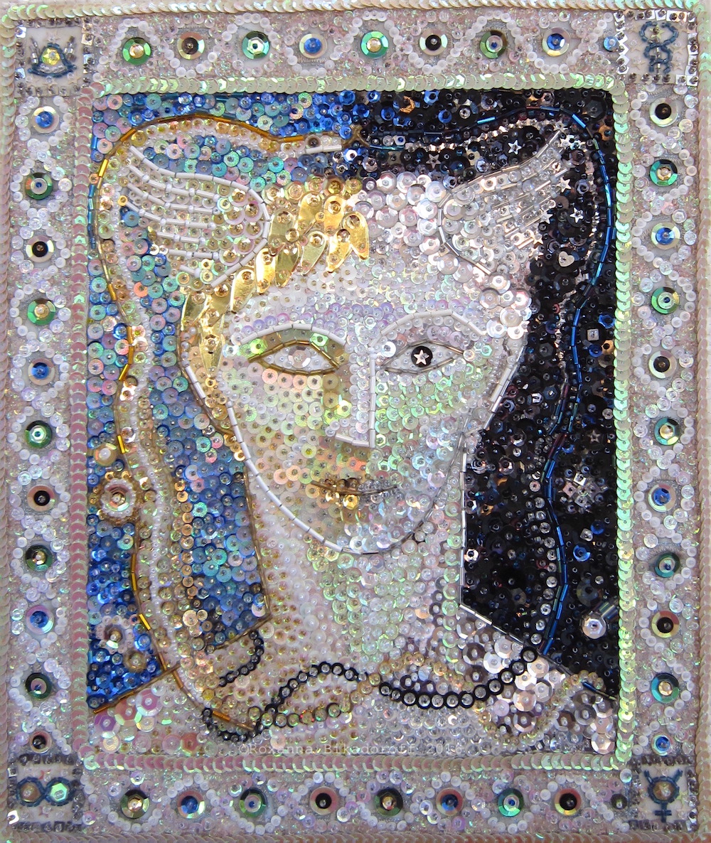 This new icon was completed during Mercury’s transit of Pisces, Virgo’s polarity, while the Lunar Nodes are in Virgo/Pisces. I mean, how Virgo-Pisces is obsessively hand-sewing Mercury with opalescent, shiny objects that resemble fish scales or bird feathers?