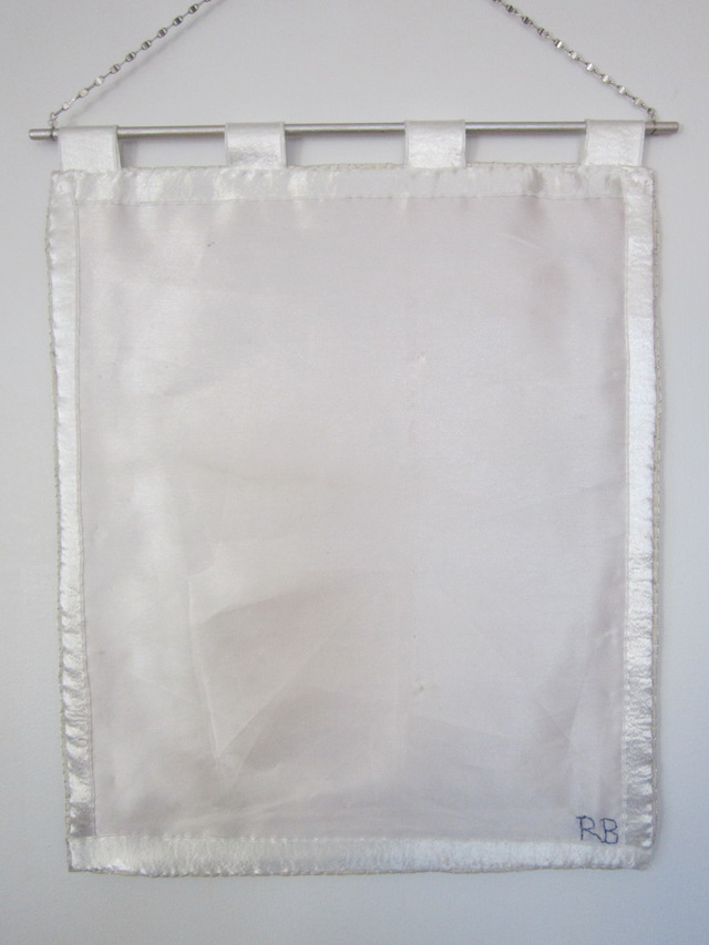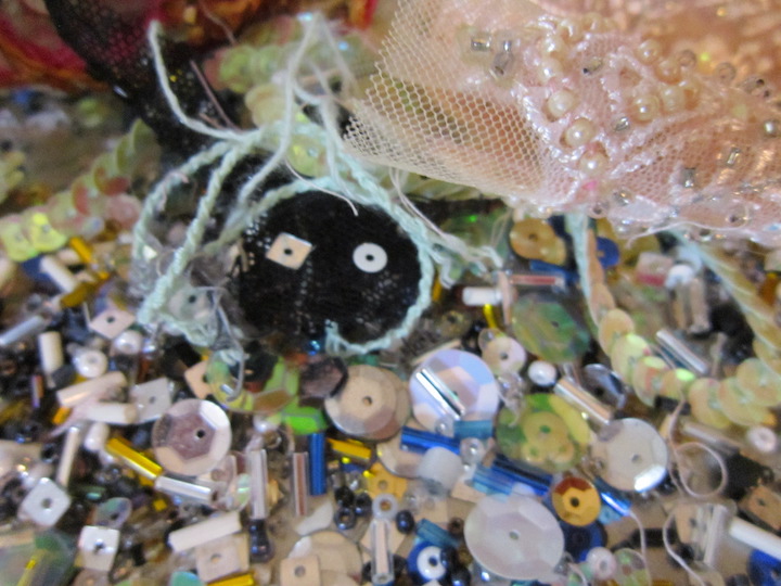materials: sequins, glass seed beads, canvas, satin, satin ribbon, thread, wood dowel, acrylic paint, metal chain.