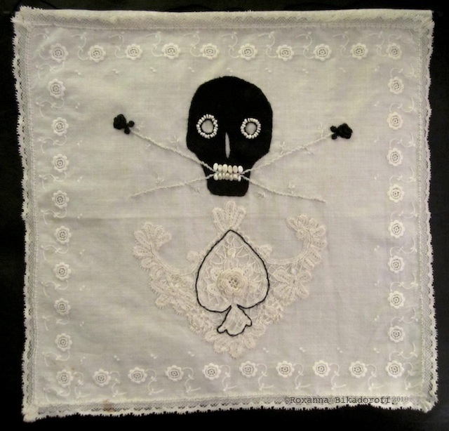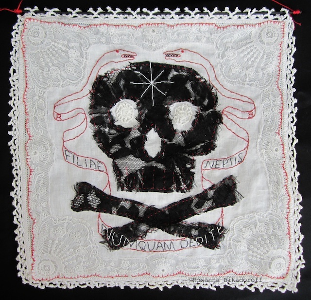 feminist pirate flag made of old lace and hankies