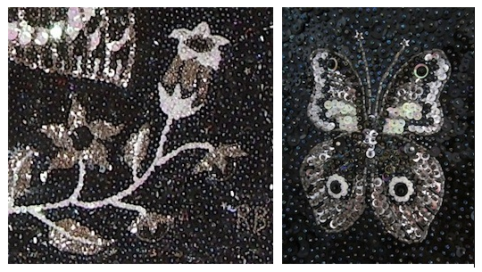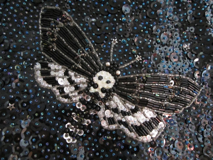 Medium being the message, I put away my paper and charcoal, and took out my unused, belly dance costuming supplies. Religious icons require materials that reflect light, be it glass, gold, movie screen or – why not? – sequins. Then I remembered having been blown away by a show of sequinned, Haitian Vodou Drapo (flags) in Montreal, some years prior, and that sealed it.