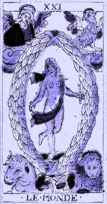 And into the 21st century, arms extended, the cosmos whirling around, I give you the Aquarian age. I embody the new century. I dance the dance of the mystical mother, the provider of life and all your immediate metaphysical frontiers. I am the intellect and heart of the living, breathing earth. I am your goddess, your scientific, subjective point of view, as object of faith. I am your garden and worthy of worship. I am the third planet in the solar system, a mystic top, whirling on axis, perfectly illuminated in the sun of infinite Buddha light. I am the deity of the new millennium. The goddess lives. I am hope and promise, card number 21. I manifest in nature, I am the World.
