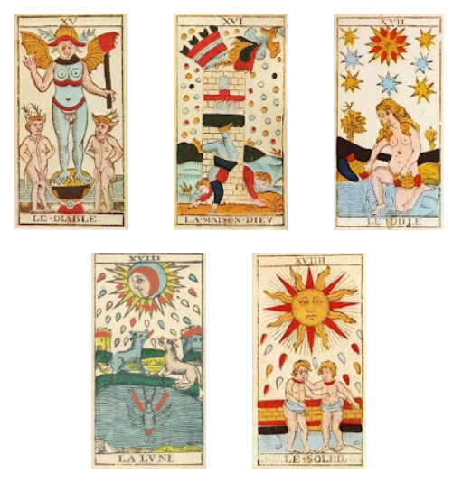 As with the fish and horses, the two tree bases in arcanum 12 are usually different, sometimes even containing sun and moon in them, as in the Vieville example. The figure can be flipped vertically and viewed two ways; hanging or dancing. His golden, solar hair is a clue to what’s going on – ‘the beauty of his inward self’ is slowly being revealed as he undergoes ‘living death’. Two of these oldest TdM examples (Vieville, Dodal) require flipping the card to read the number correctly – printer mistake?