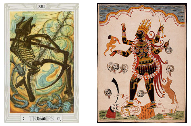 In traditional TdM, the golden-haired Charioteer at first appears to be a solar-heroic, Roman emperor type. But his stance says Dionysus and, indeed, the very word ‘triumph’ comes down to us not from Roman victory processions, but from hymns to Dionysus sung in processions in his honour. So rather, the Charioteer is a conglomerate – albeit, like MacBeth, he is more Apollonian on the outside.