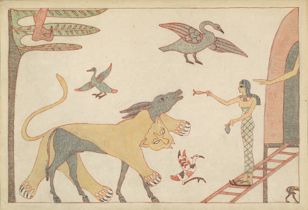 11 has also been called the ‘mute’ number (perhaps because it is ‘neuter’; odd but reduces to even). In the woodcut above, Apollo’s serpent, fitted with the ‘special Cerberus of Serapis’ head (lion flanked by dog and wolf, which was also a hieroglyphic allegory of Prudence) descends the spheres from heavenly Apollo to the silent, chthonic realm of Thalia, equated with the musical pause. One can’t help drawing a parallel to La Force, with her looped, serpentine hat above, bare foot firmly planted on the Earth, and, in the Conver card, the 9 sections in her cuffs. Also to Dante’s three beasts.