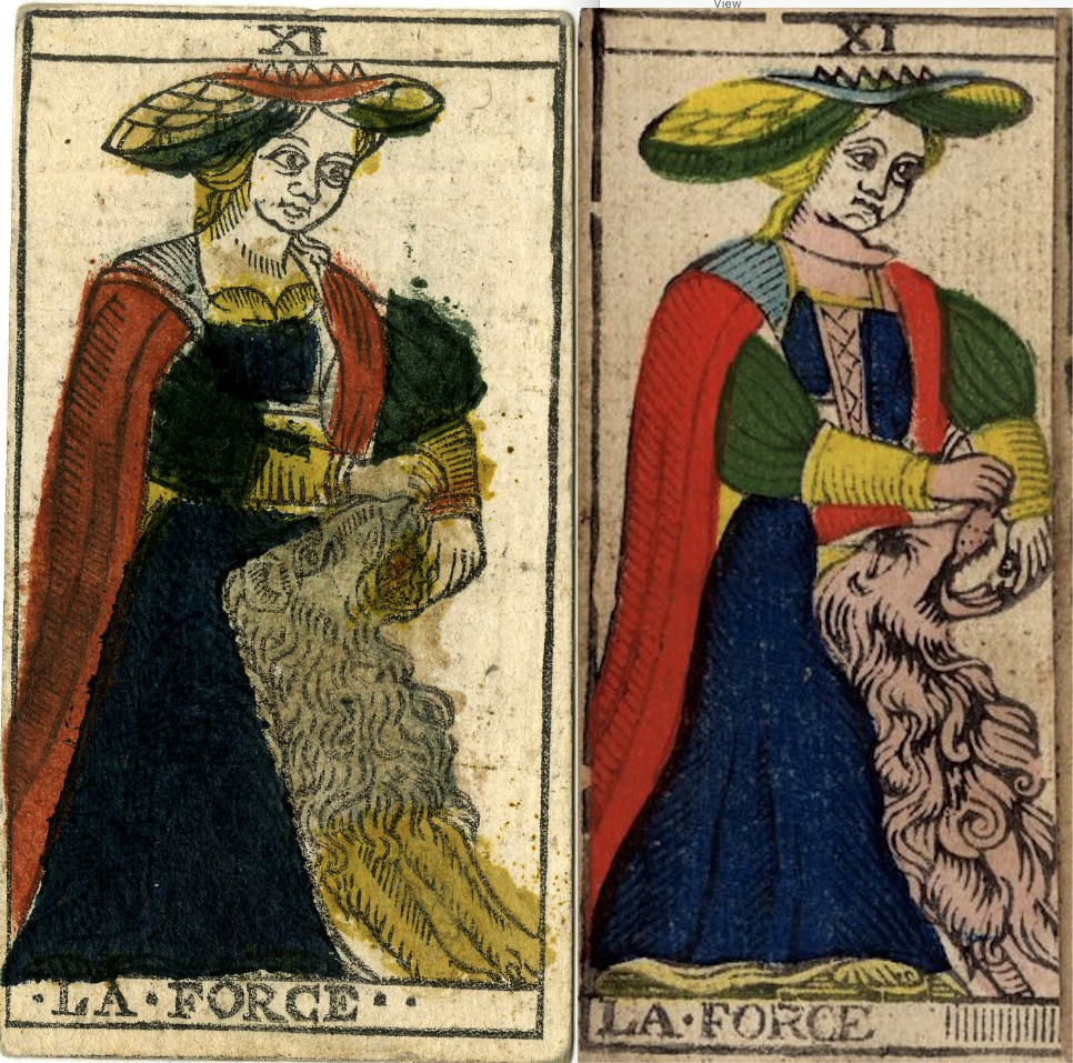 Earliest examples of the Fortitude card expressed the concept allegorically as physical strength/courage; Hercules or Samson beating up the lion or a formidable lady exerting control over it (taming animal instinct or temperament). Alternately, this formidable Virtue could be found grasping or busting up a pillar, as you do. Sadly, the dragon-extractor with an anvil on her head standing on a wine press didn’t get selected…guess Medieval fashions had become passé.