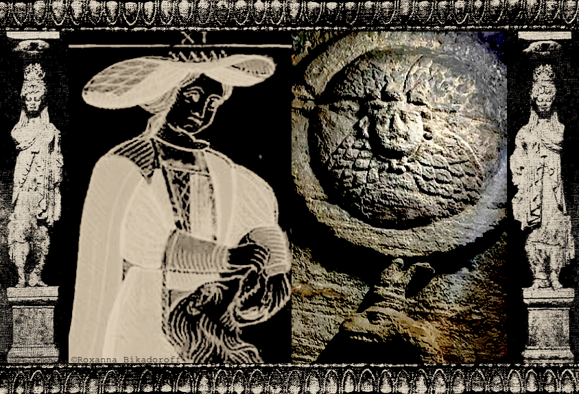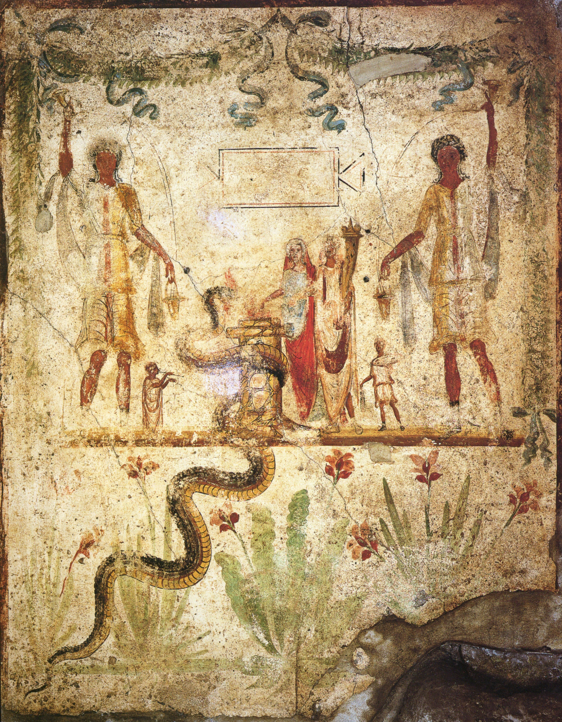 So, in this case, the serpentine ‘petals’ of the gorgoneion in the tomb are pinecones just like in the thyrsus the Agathos Daimon below holds. Can’t believe I didn’t catch that!!