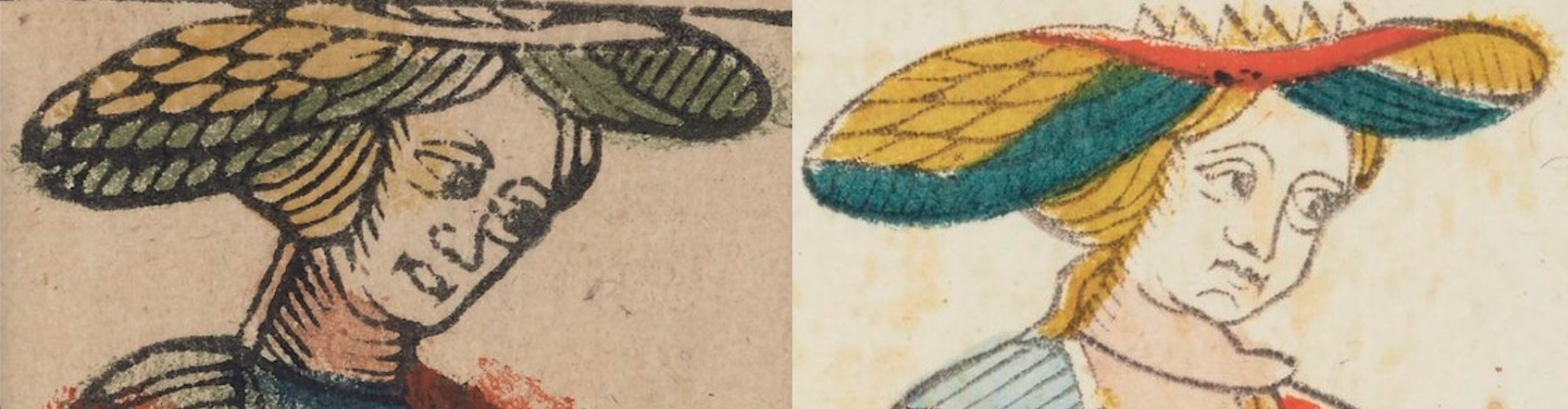 Welcome back. Now let’s return to the card in question and examine some details of our TdM mistress, beginning with her infamous hat. Many have noted its ‘lemniscate’ shape, but otherwise it’s a conundrum. Examples of Renaissance era straw hats, hair nets (most likely) and headgear are continually compared, as if to suggest there is no other reason for its weird shape except that’s just (kind of like) what people wore. Well, alright, but why did the artist choose this particular shape of hat, for this particular card? Consistent in Tarot de Marseille, which takes cues from Renaissance art, is that the image components must serve more than one, visual function and must therefore remain vague enough to evoke or suggest, but never give the whole game away. It’s a puzzle we are invited to figure out.