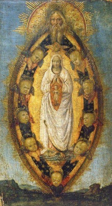 The Visconti-Sforza card depicts a beautiful fountain with water flowing from the ‘waxing’ and ‘waning’ flowers. Its central flower is aligned with the vessel-shaped winged figure, which may or may not have a full Moon face (it is too damaged to be certain). Under the Visconti, 14th-early 15th century Milan was a centre of Marian veneration out of which, despite macho, power politics, much wealth, beauty, art and culture was generated (or re-generated), including the hand-painted Tarot cards that bear their name.