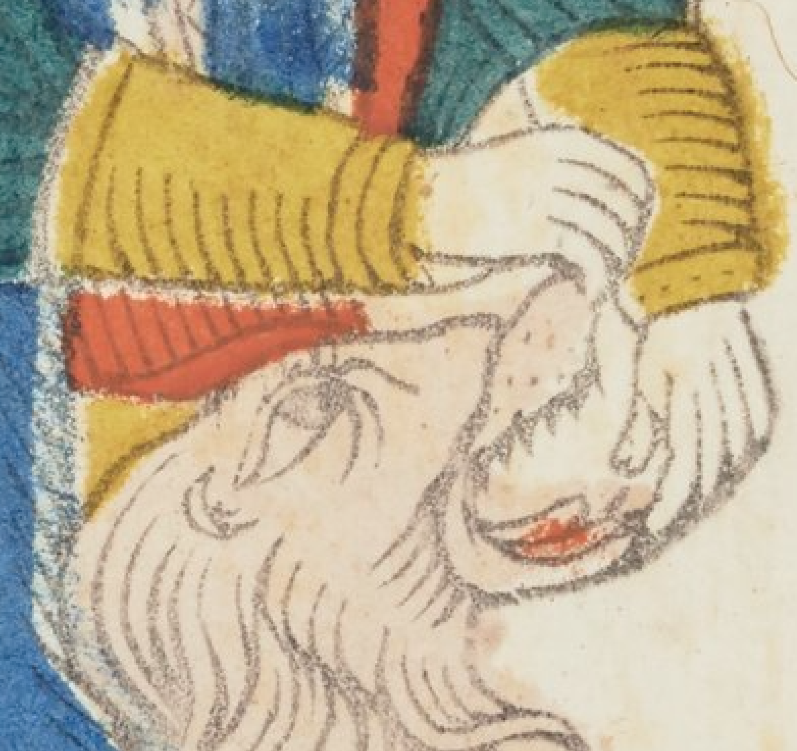 ..I add that this liturgical sequence was unknown to scholars at the time of the Renaissance, which suggests a direct transmission, far from the elites of that time. Same concealment technique with the strange hat of Force, with the pine cone of the thyrsus decorated with a knot, plus undoubtedly a snake and a crown of ivy, all attributes of the bacchantes. And a bacchante thinking of tearing off the head of a lion with her hands is known in Euripides’ tragedy The Bacchae, when it was about her own son, Pentheus.