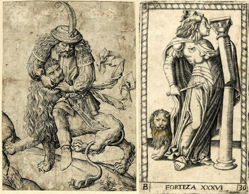 Engravings: Samson rendering the Lion late 15th c, Hans Ledenspelder ‘Forteza’ (after 15th c “Mantegna” prints) mid 16th c