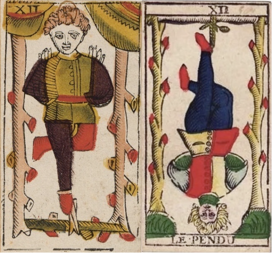 Interesting, then, that the very next card, #12 Le Pendu/The Hanged Man depicts exactly such a figure; a man with golden locks who appears to be hanging head down, in limbo and, when flipped, dancing with his head in the heavens. No wonder his face expresses not agony but ‘mind in continued suspense by presenting the paradox of an ‘inherent transcendence’.