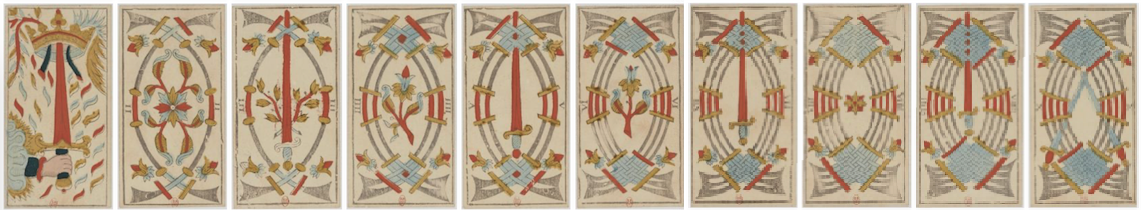 Notice how the TdM suit continually ‘blinks’ from sword (masc/odd) to flower (fem/even), until a blending of both (active red becomes passive blue, one sword becomes two) in the last card. The design is thought to be based on playing cards that originated during the Mamluk sultanate in Egypt, which ended in the early 16th century.