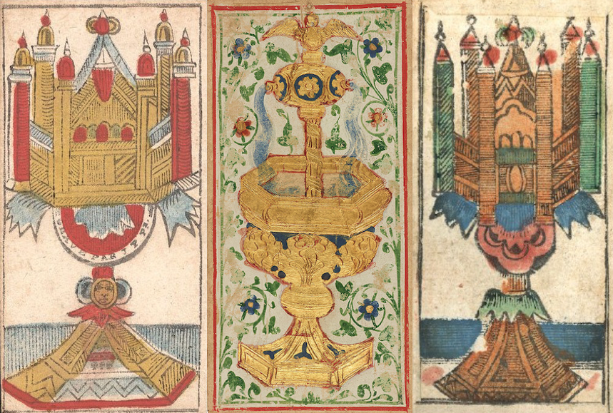 In the three Aces of Cups, above, the lunar triad and feminine symbolism is obvious, as is a hint of Islamic influence. In the two, printed cards, it almost looks as if her ‘house’ has been up and transplanted (from the Holy Land?).