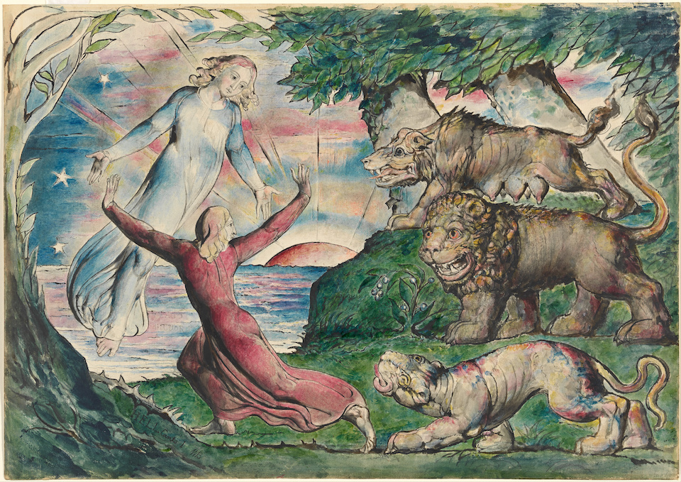 Throughout history, initiations have been performed in caves, or underground, in the belly of the Great Mother. We know that mystery initiates confronted the darker aspects of themselves during the simulated death experience that is essentially descent into the ‘unconscious’. Dante, who bridged classical/Pagan and Christian theologies, would have been no stranger to this idea. The three scary beasts he meets in the dark wood – a leopard-like creature, a lion and a she-wolf – are usually understood as fraud, violence and greed/incontinence, i.e., the very shadows of our three Virtues, whether personal or collective (the she-wolf, which frightened him most, is also thought to symbolize Rome).