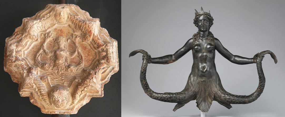 A more joyous union, or at least the beginning of one, is beautifully illustrated in the 2 of Cups. Typically in Tarot de Marseille, the two dolphin-fish are slightly different in appearance. This twin fish theme, besides being Piscean, can also be traced back to the ancient, pagan world. In the sanctuary of Didyma (“twins”, thought to refer to twin temples of Apollo and Artemis), Greece, for example, we find a figure not unlike the split-tailed melusine (aka the Starbucks mermaid), who grasps her two tails, or sometimes two fish, much like the ones in the Cups card.