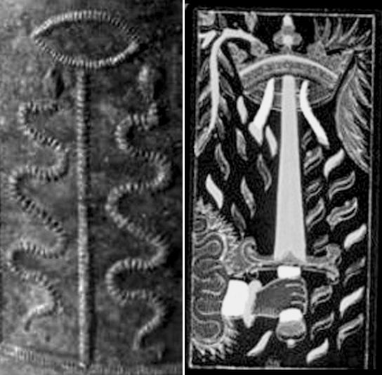 So ‘Double Double’ refers to the two sides of fate and of human duality. With ascension to power, fame, wealth, there are pitfalls, if the destructive/shadow side of a man’s nature is not kept in check. This poster for the Polanski film depicts the reverse of an emblem we recognize as the Tarot Ace of Swords. In the card, the sword of Truth, pointing up, is both penetrating and girdled by the yonic crown of Wisdom (Sophia); the olive branch (lunar) of peace and palm frond (solar) of victory are held in equilibrium. I believe the symbol might possibly come from the Isis lotus flanked by two serpents, below.