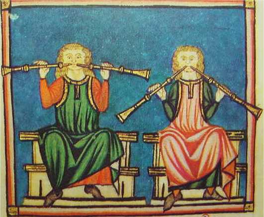 The 2 of Cups was one of the minor arcana cards with a space where a printer could put their name or an emblem. In these two examples, the emblem beneath the cups is not unrelated, heralding love and peace (the heart and olive branches). This card had come up in a discussion, recently, regarding the two ‘trumpets’ therein. Are they in fact trumpets? If so, what kind? Though they resemble telescopes, it’s probably something like a buisine or the North African import, below, played at processions, celebrations funerals and especially weddings.