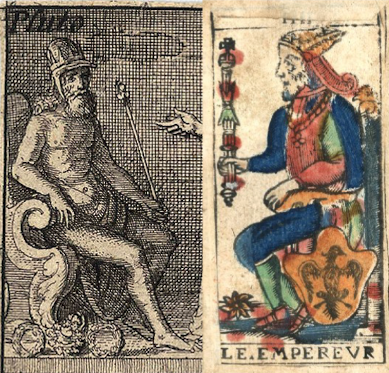 This is where it gets a bit esoteric, because TdM imagery is never this = that. We can find associations in the Emperor card to Jupiter (imperial eagle on his shield, sometimes a thunderbolt in his sceptre, bearded), Mars and Mercury (rooster, as mentioned), as well as the Sun (rooster, medieval 4th sphere, wears a radiate crown over his helmet), but what about Pluto? Pluto/Hades was, after all, an aspect of the Jupiterian triplicity, one of the ‘bros’.