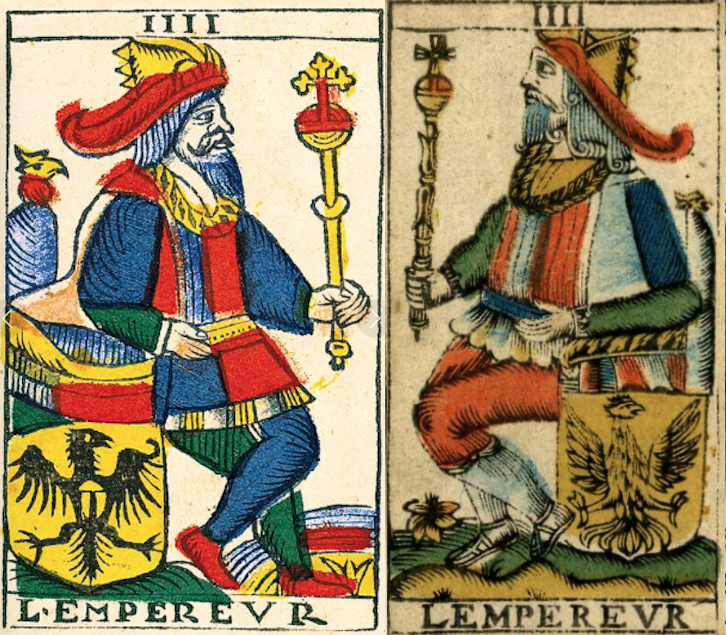In the two versions below, you’d be forgiven for thinking the bird head on the back of the Emperor’s throne was just another eagle, being the imperial bird (and in the first card, it appears to be), except for a couple of other clues; in the 2nd card, the arm of the throne is clearly ‘feathered’ like a rooster’s tail. Also there is the fact that the brim of the Emperor’s helmet-crown is almost without exception consistent in its red colouring.