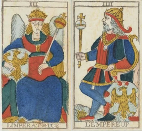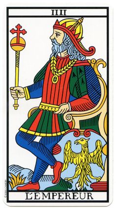 The aging Emperor is typically shown in profile, facing the Empress/past and with his back to the next cards/future (if they were laid out in numerical order). He will not go further in his current form, but holding his sceptre erect, looks to his lady for renewal, while she, in turn, holds her sceptre to her womb.