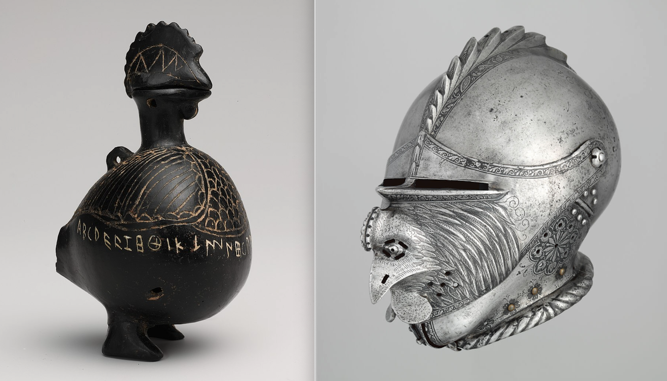 Etruscan buccher 630-20 BC and German Rooster helmet c 1530 (MET Museum, NY)