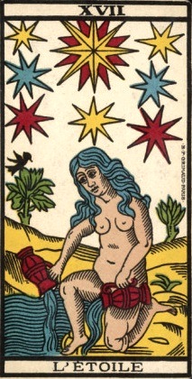The Hanged Man/Le Pendu reveals that there are many different perspectives from which we can view things (Tarot, for one) and sometimes a new outlook can change the course of our lives. When turned ‘right-side up’, as many have noted, he appears to be doing the maenad jig, like the Hermetic-Bacchic-Orphic-Christ-Androgyne in the mandorla, thereby assuring us it’s all necessary, that we all turn upside down in water before undergoing birth trauma and finally re-emerging as a complete being in a state of grace. But at this point, 21 is still a long way off. The ‘dark night of the soul’ has only just begun. ~rb